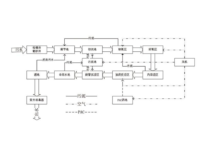 1、采用成熟的AO或A2O生化處理工藝路線,具有良好的去除污水中的有機(jī)物和較好的脫氮功能,以滿足排放標(biāo)準(zhǔn)的要求;